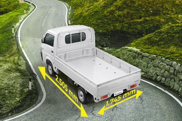 Mengenai dimensi. Bak New Carry Pick Up kini memiliki panjang 2.505 mm, lebar 1.745 mm dan tinggi 425 mm. Ruang angkut ini sanggup menampung muatan seberat 1 ton. Agar isi tetap aman selama perjalanan, pelanggan dapat memanfaatkan pengait yang ada di sekeliling bak untuk mengikatkan barang. Ada 12 pengait tipe FD (Flat Deck) dan 22 pada tipe WD (Wide Deck).